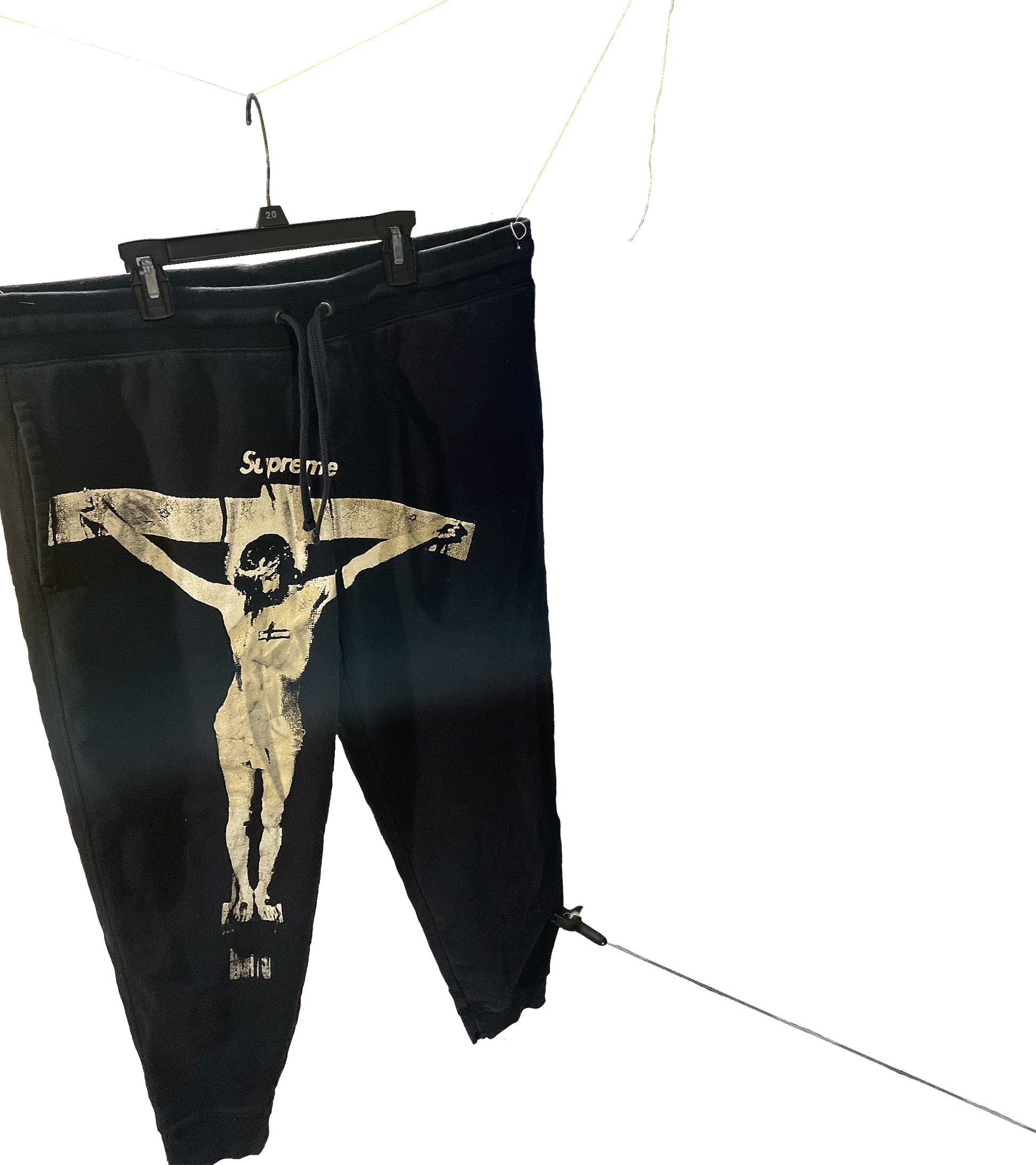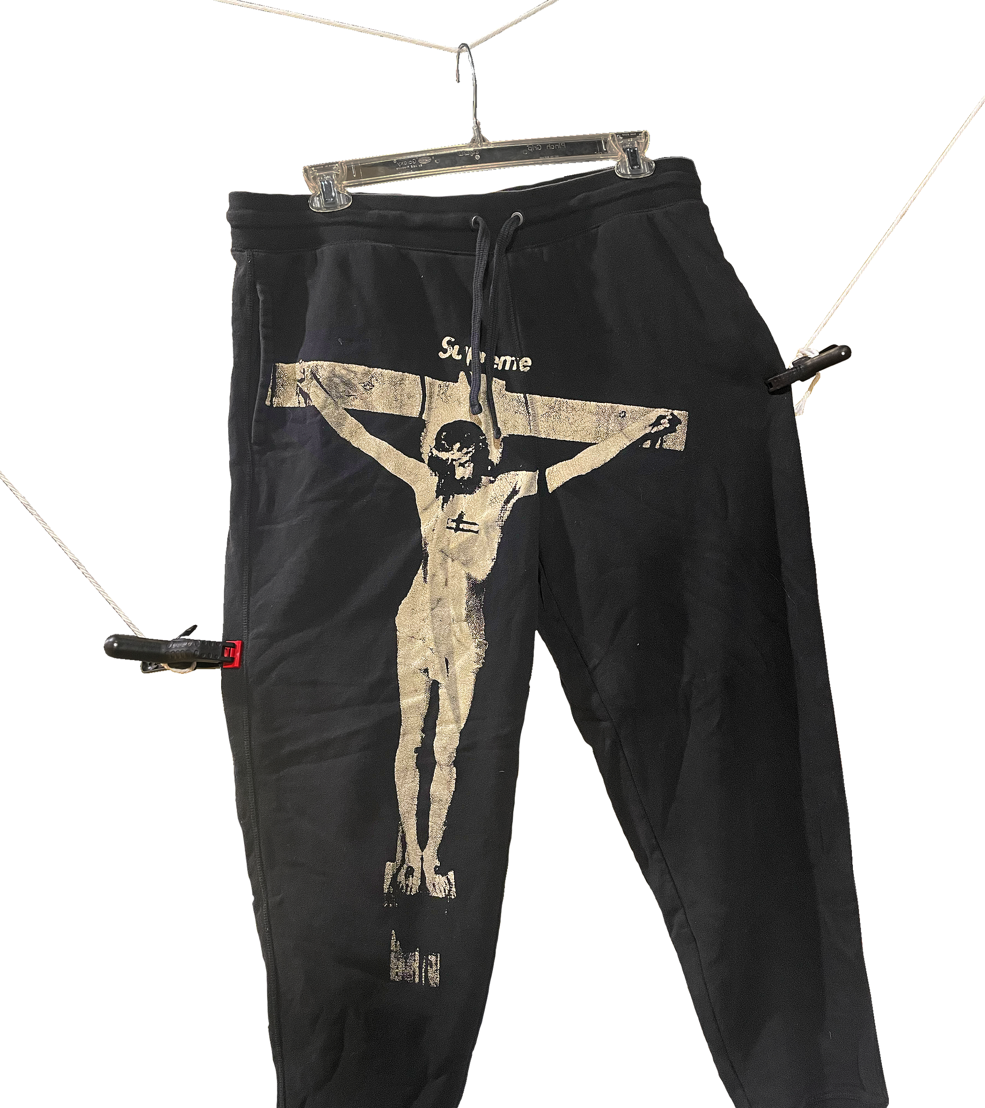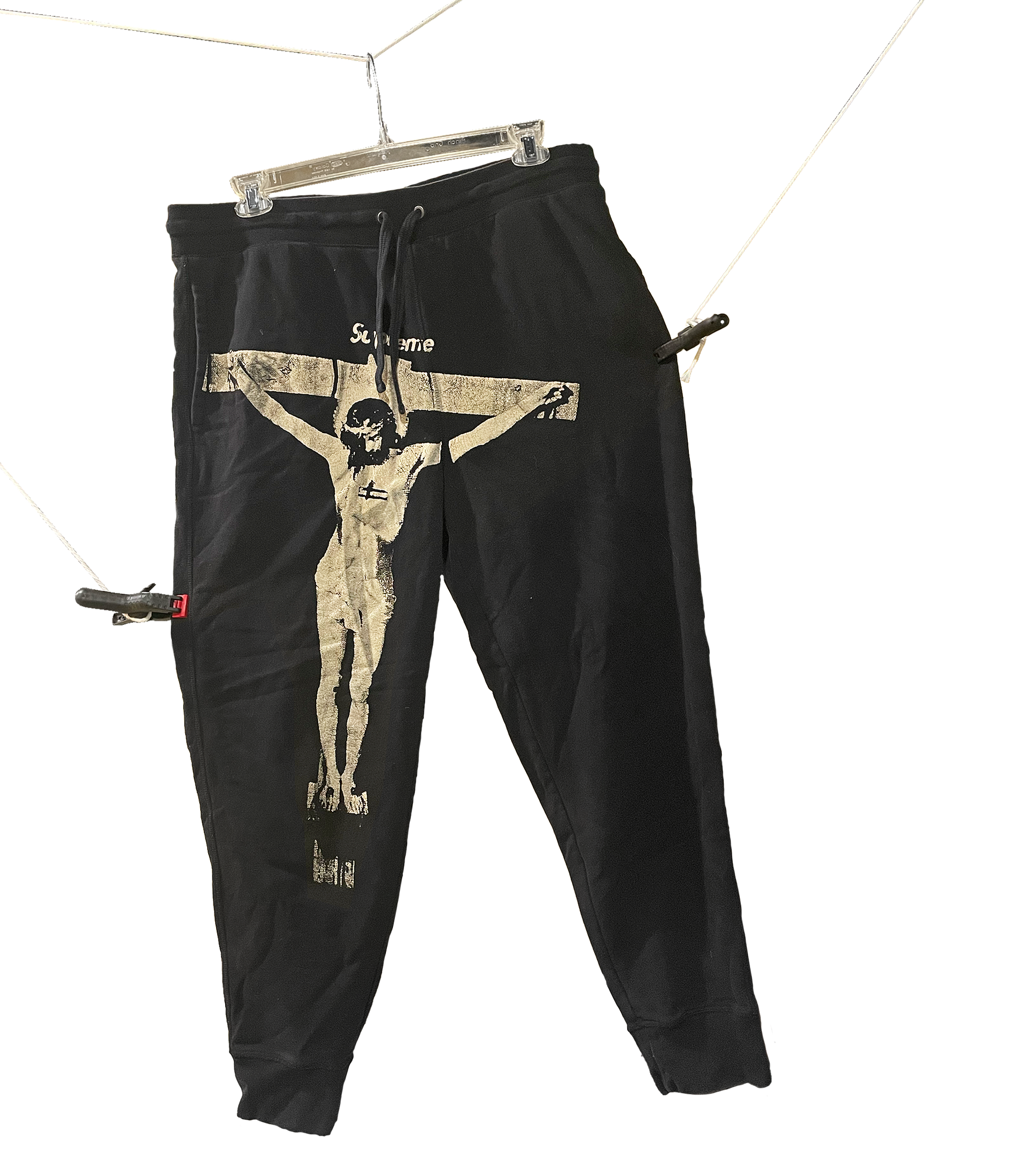 Hand printed vintage esque supreme jesus cream colored print on heavyweight sweatpants. Massive cracked and distressed crucifix print down the front side of pants. Super heavyweight high quality blank. Comes with a graysonfuckingsucks sticker and discount code.